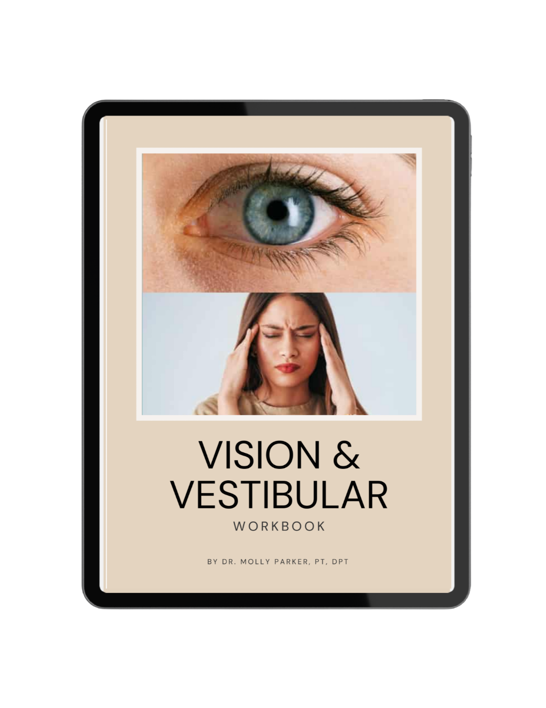 And then of course, at the very bottom you have the link either here or you can click the photo to your Vision and Vestibular workbook. And if you want to go to the community for any reason, you would simply click here and you can ask any questions. So go in, close your eyes, because I'm going to scroll up.